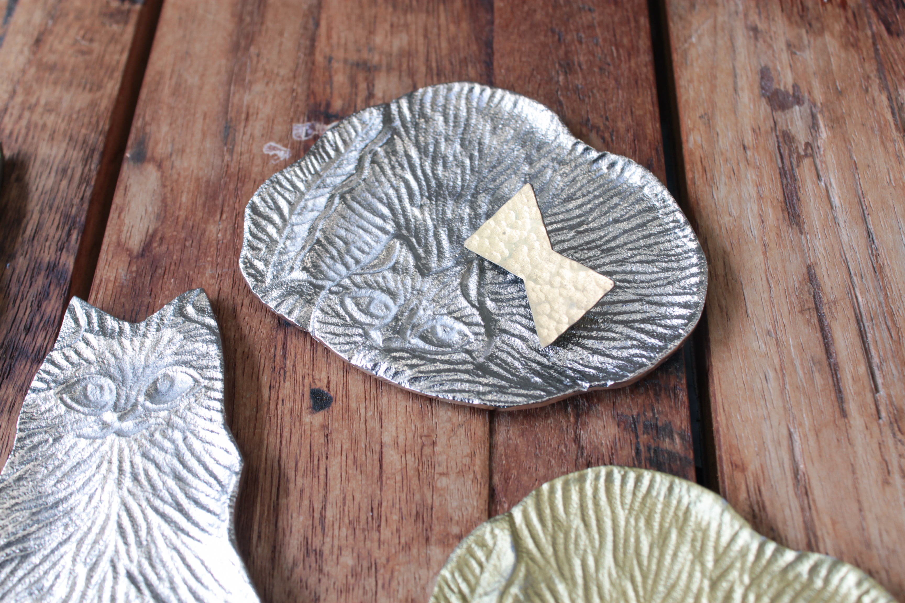 人気のアルミシリーズにネコ型が登場!インド製の味のある風合いが魅力。トレイはアクセサリートレイや、おやつをのせても。